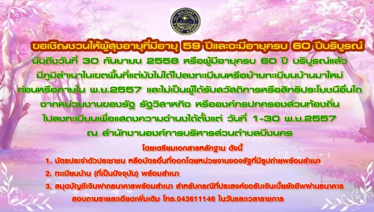 ขอเชิญชวนให้ผู้สูงอายุที่มีอายุครบ 59 ปี และจะมีอายุครบ 60 ปีบริบูรณ์ นับถึงวันที่ 30 กันยายน 2558 หรือผู้มีอายุครบ 60 ปี บริบูรณ์แล้วมีภูมิลำเนาในเขตพื้นที่แต่ยังไม่ได้ไปลงทะเบียนให้ไปยื่นความประสงค์ได้ที่ อบต.บึงนคร ในวันและเวลาราชการ...
