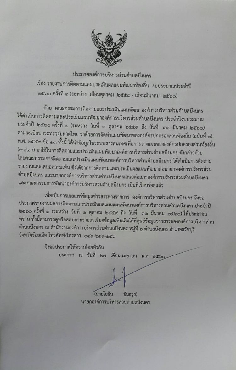 แผนติดตามและประเมินผลแผนพัฒนาท้องถิ่น ประจำปี 2560 ครั้งที่ 1