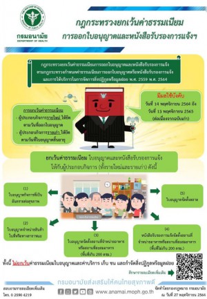 กฎกระทรวงยกเว้นค่าธรรมเนียมการออกใบอนุญาตและหนังสือรับรองการแจ้งให้กับผู้ประกอบกิจการ (ทั้งรายใหม่และรายเก่า) มีผลบังคับใช้วันที่ 14 พฤศจิกายน 2564 ถึงวันที่ 13 พฤศจิกายน 2565 ทั้งนี้ ไม่ยกเว้น ค่าธรรมเนียมใบอนุญาตและค่าบริการ เก็บ ขน และกำจัดสิ่งปฏิกูลมูลฝอย