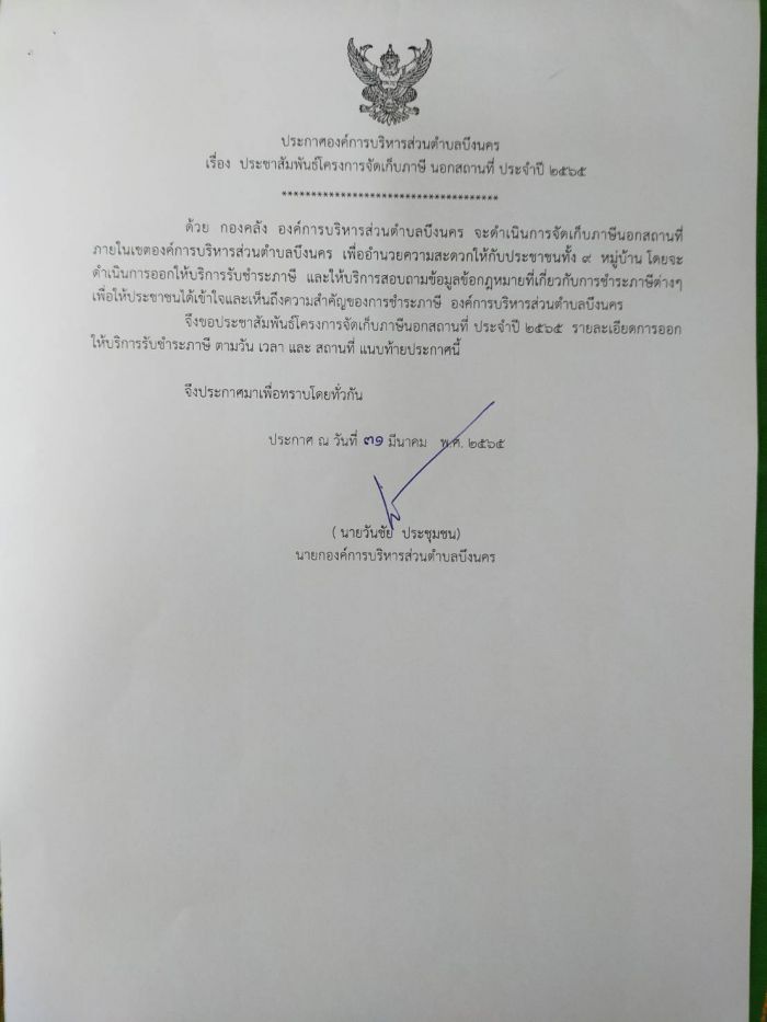 หัวข้อ :: ประกาศประชาสัมพันธ์โครงการจัดเก็บภาษี นอกสถานที่ ประจำปี 2565